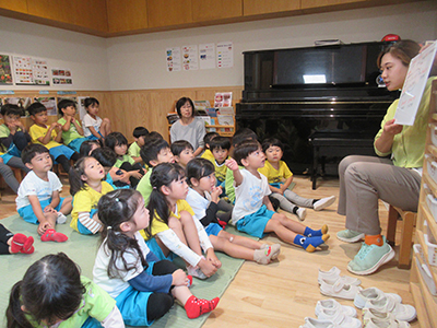 元気に登園してきた子どもたちは、荷物整理の後、絵本やお話を聞いたり、室内でゆったりと遊んだりします。