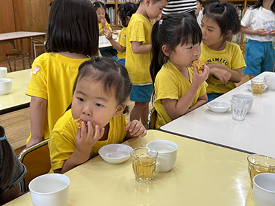「きょうのおやつは、なにかな?」と朝から楽しみにしていたおやつの時間です。手作りのおやつをおいしそうに食べています。